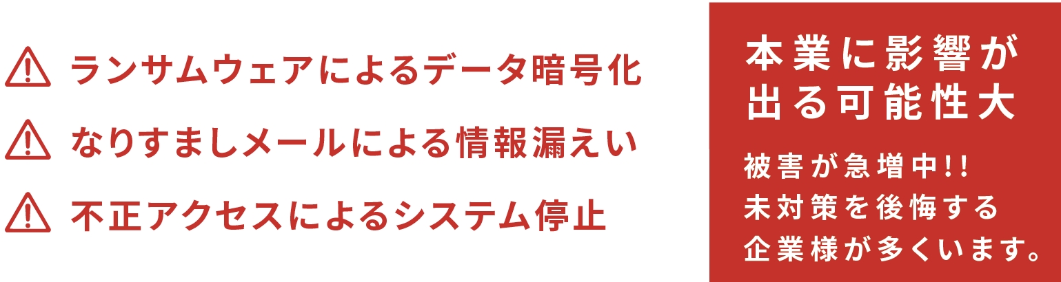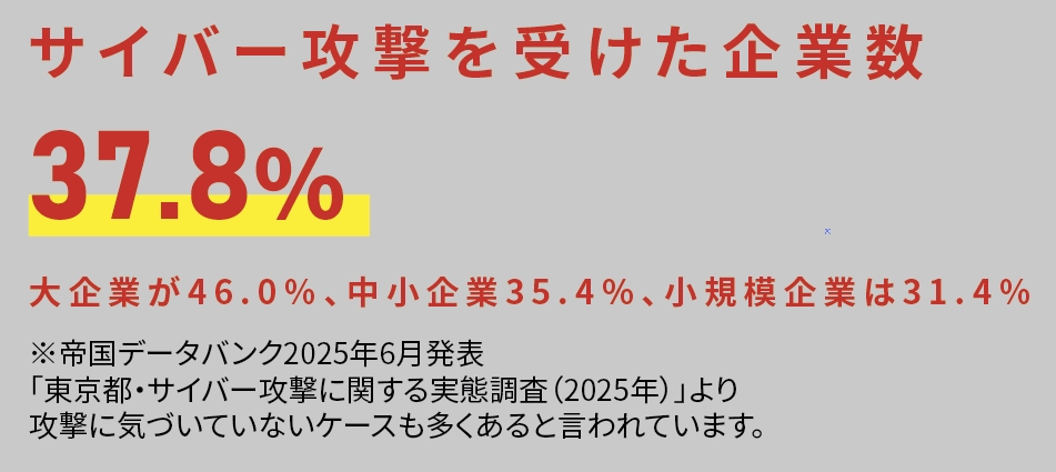 NWCでは、こうしたリスクからお客様を守るため、PCのセキュリティ強化から保険支援までワンストップでサポートしています。 まずはお気軽にご相談ください。 ※実際のサポートは、弊社提携のサイバー対策専門会社が行います。 近年、企業規模を問わずサイバー攻撃の被害が急増しています。 「自社には関係ない」と思っていませんか? 実際には、中小企業こそ狙われやすく、被害を受けると事業継続に大きな影響が出るケースもあります。 ランサムウェアによるデータ暗号化/なりすましメールによる情報漏えい/不正アクセスによるシステム停止       サイバー攻撃を受けた企業数 37.8% 大企業が46.0%、中小企業35.4%、小規模企業は31.4% ※帝国データバンク2025年6月発表 「東京都・サイバー攻撃に関する実態調査(2025年)」より 攻撃に気づいていないケースも多くあると言われています。 NWCでは、こうしたリスクからお客様を守るため、PCのセキュリティ強化から保険支援までワンストップでサポートしています。 まずはお気軽にご相談ください。 ※実際のサポートは提携代理店が行います。